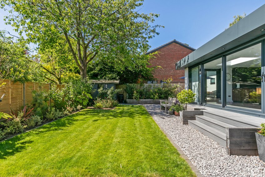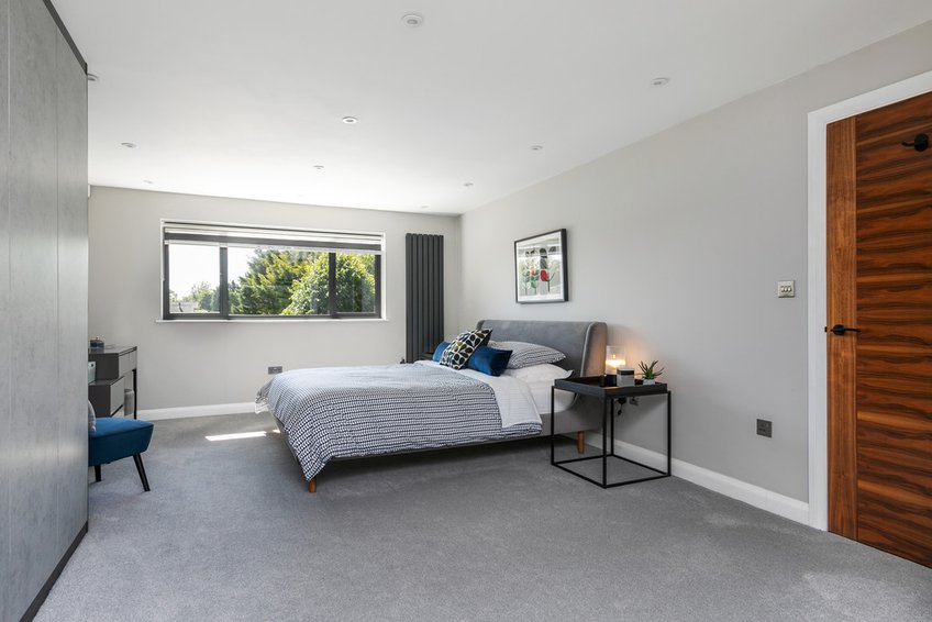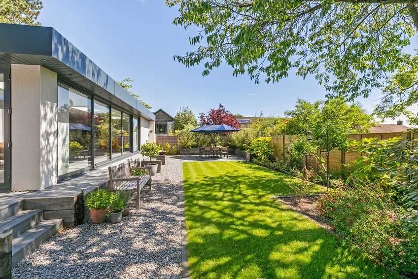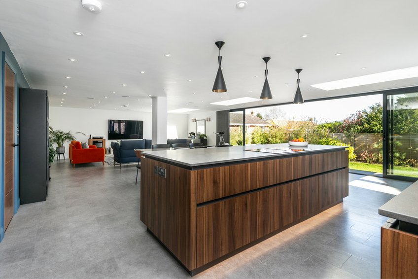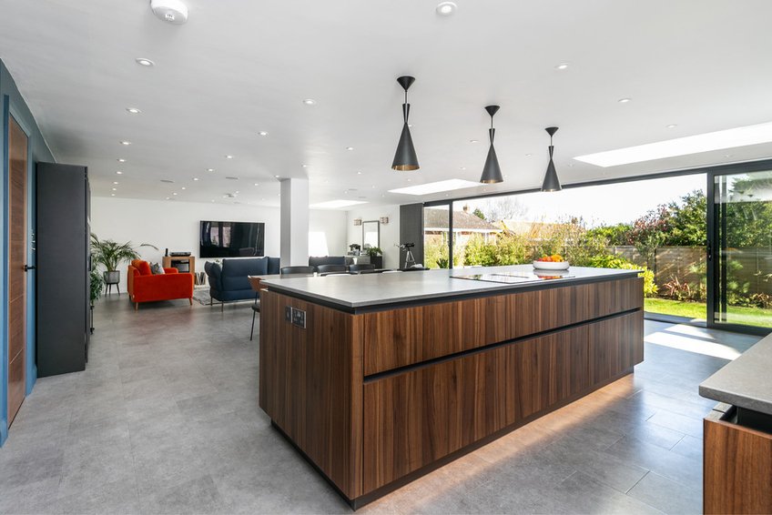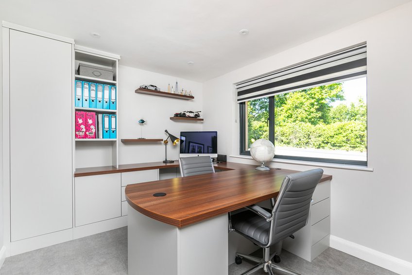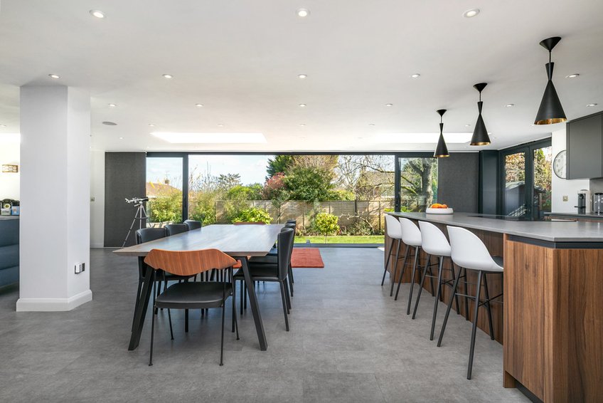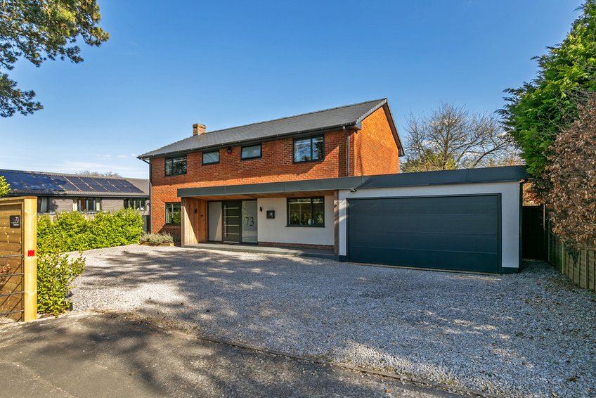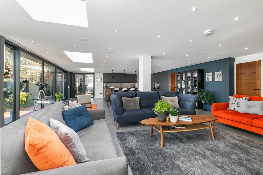 This spacious detached house has been completely renovated throughout and provides exceptionally well-presented accommodation over its two floors. An oversized front door is flanked by glazed slips and opens into a welcoming entrance hall which is fitted with a bespoke metal framed staircase with beech treads rising to the first floor. One side of the hallway is a snug with a front aspect window, whilst the other side is a fully fitted home office with two desks, drawers and filing space. The heart of the house is undoubtedly the kitchen/dining/sitting room which is an expansive space providing excellent natural light with three roof lights and sliding doors to the rear aspect with French doors opening onto the deck. The kitchen is fitted to one end with a 'Leicht' German kitchen with dark wooden effect base units and contrasting grey eye level units with sleek grey quartz worktops, appliances include a full height fridge, freezer, dishwasher, two ovens with a warming drawer and a fitted 'Quooker' boiling water tap. There is a walk-in pantry cupboard and an induction hob with extraction system is inset into a large island unit with breakfast counter to one side that neatly delineates the kitchen and with ample space for a large dining table with a large sitting room space. A large separate utility room keeps appliances out of the kitchen and can be accessed from the garage and external door. There is a cloakroom that completes the ground floor accommodation.