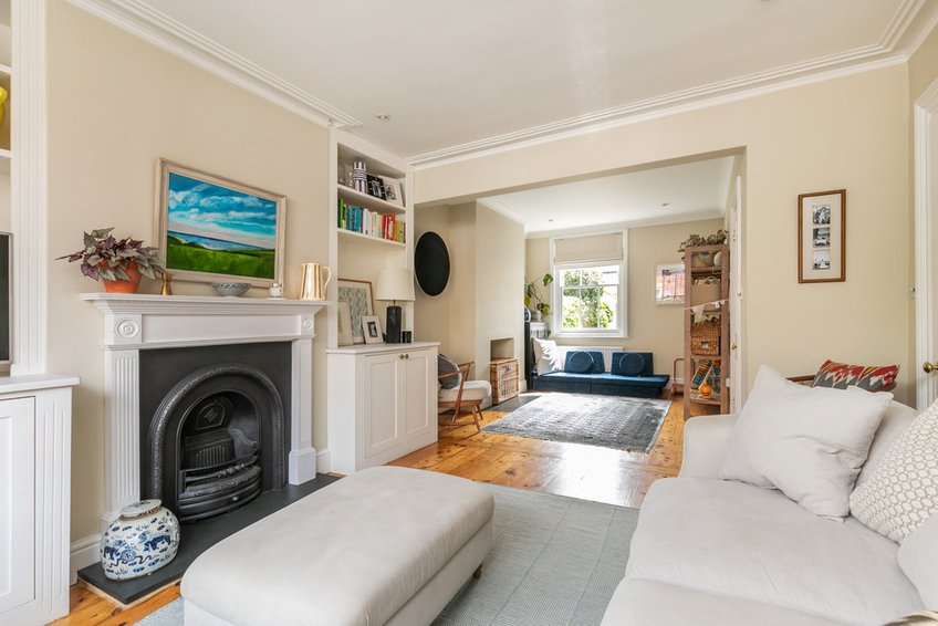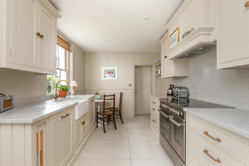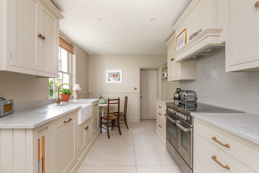Set back from the street behind a mature hedge affording privacy and with space for storage, a path leads to the recessed entrance porch protecting the front door, which opens into a lovely entrance hall with stripped and polished floorboards, plaster arch with corbels and stairs to the first floor with a storage cupboard beneath. The sitting/dining room has an east/west aspect and provides excellent natural light with a bay window to the front with sash openers, a pretty period fireplace flanked by bespoke fitted, low level cupboards and a window to the rear aspect, there is again stripped and polished floorboards. The kitchen has been beautifully refitted with a range of traditional cream fronted 'in frame' style cabinetry, with bronze handles with white marble style countertops and upstands, fitted range style cooker, integrated dishwasher and butler sink. The large ceramic tiled floor is heated for comfort; the breakfast end has an ingenious banquette style seating and provides space for a bistro table and chairs. A utility room and separate cloakroom complete the ground floor.