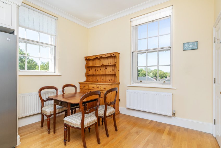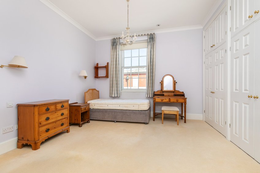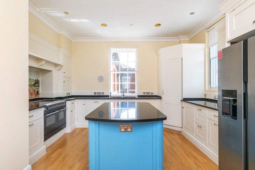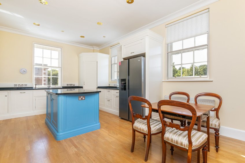 Situated within one of Winchester's most sought after addresses, this top floor apartment exudes opulence with high ceilings and large windows that help create a wonderful light atmosphere. The lift or stairs rise to the third floor, with a private door opening into spacious entrance hall with a window to the west elevation, there are two fitted storage cupboards. The kitchen/dining room is a well proportioned, triple aspect room, fitted with a range of hand painted in frame style units and topped with sleek black granite countertops, there is a fitted range style cooker and a pantry/larder cupboard as well as an American style fridge/freezer. A centralised island unit is painted in a contrasting colour with a matching granite worktop with drawers and cupboards below. The drawing room is double aspect and faces east/west with a fireplace and bespoke fitted cabinetry. The principal bedroom has an ensuite shower room and two sets of wardrobes, whilst the second bedroom has been fitted out as a study with a desk, drawers and wardrobes, although offers space for a bed.